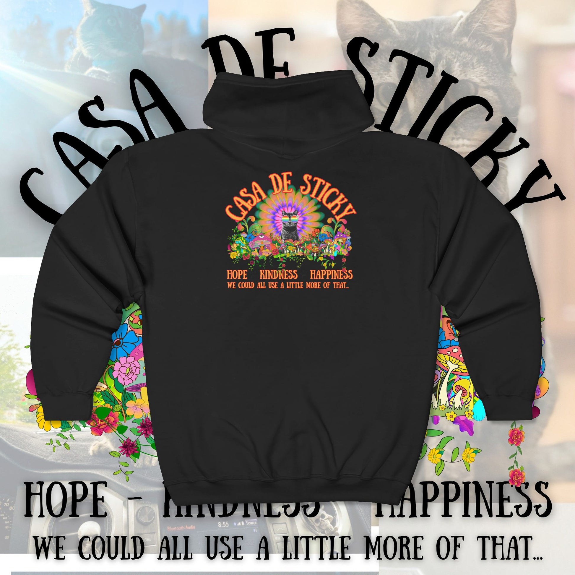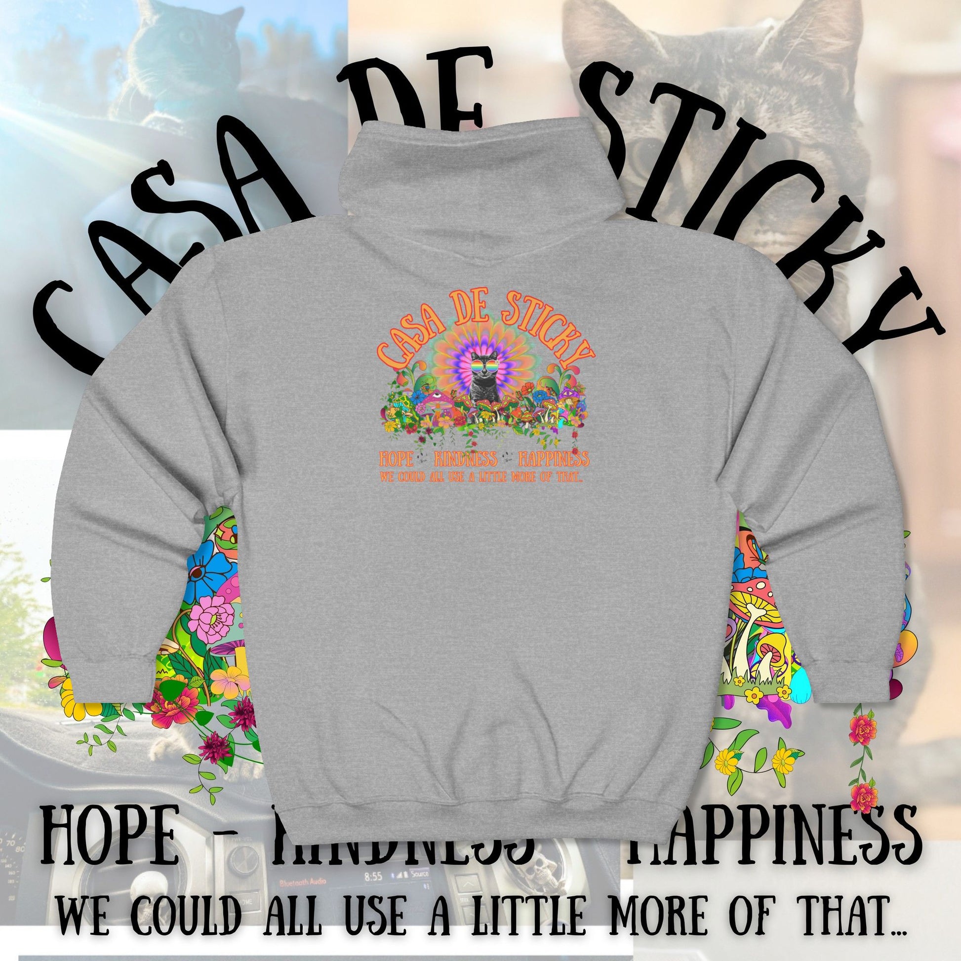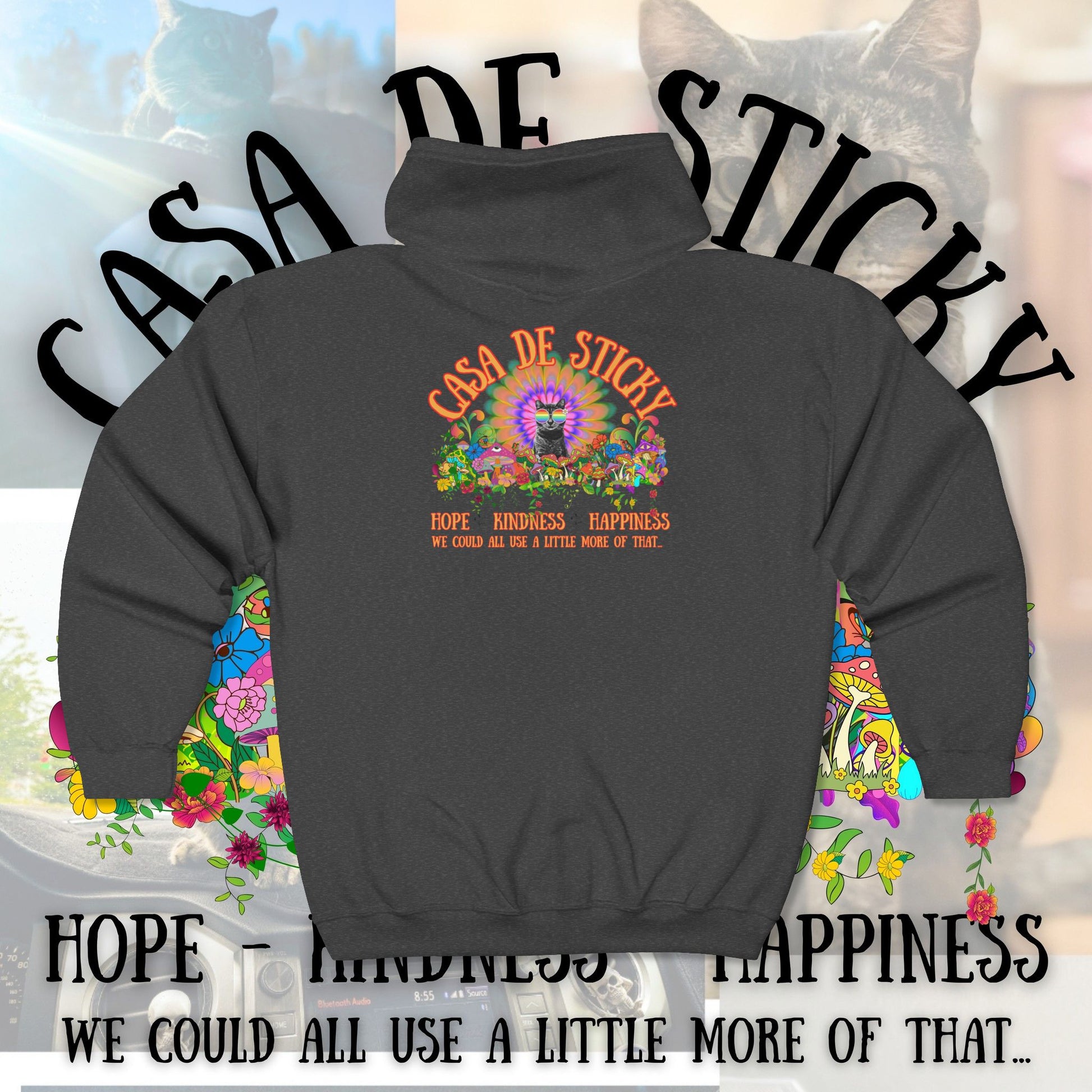 Featuring Sticky at the heart of a vibrant, psychedelic design, this hoodie is more than cozy apparel โ itโs a symbol of the movement youโre helping build. Every hoodie sold directly supports the creation of Casa de Sticky, helping turn heartbreak into healing.