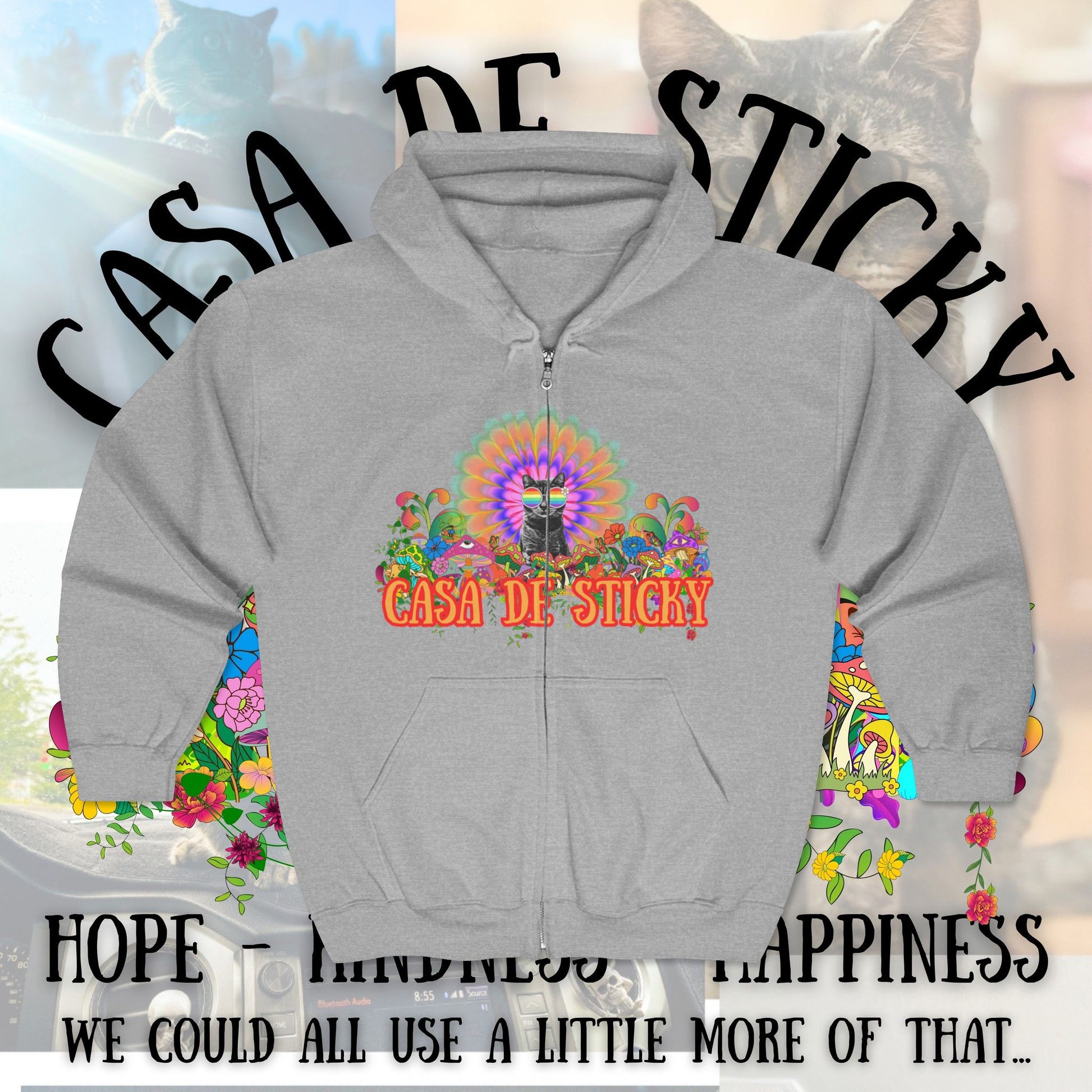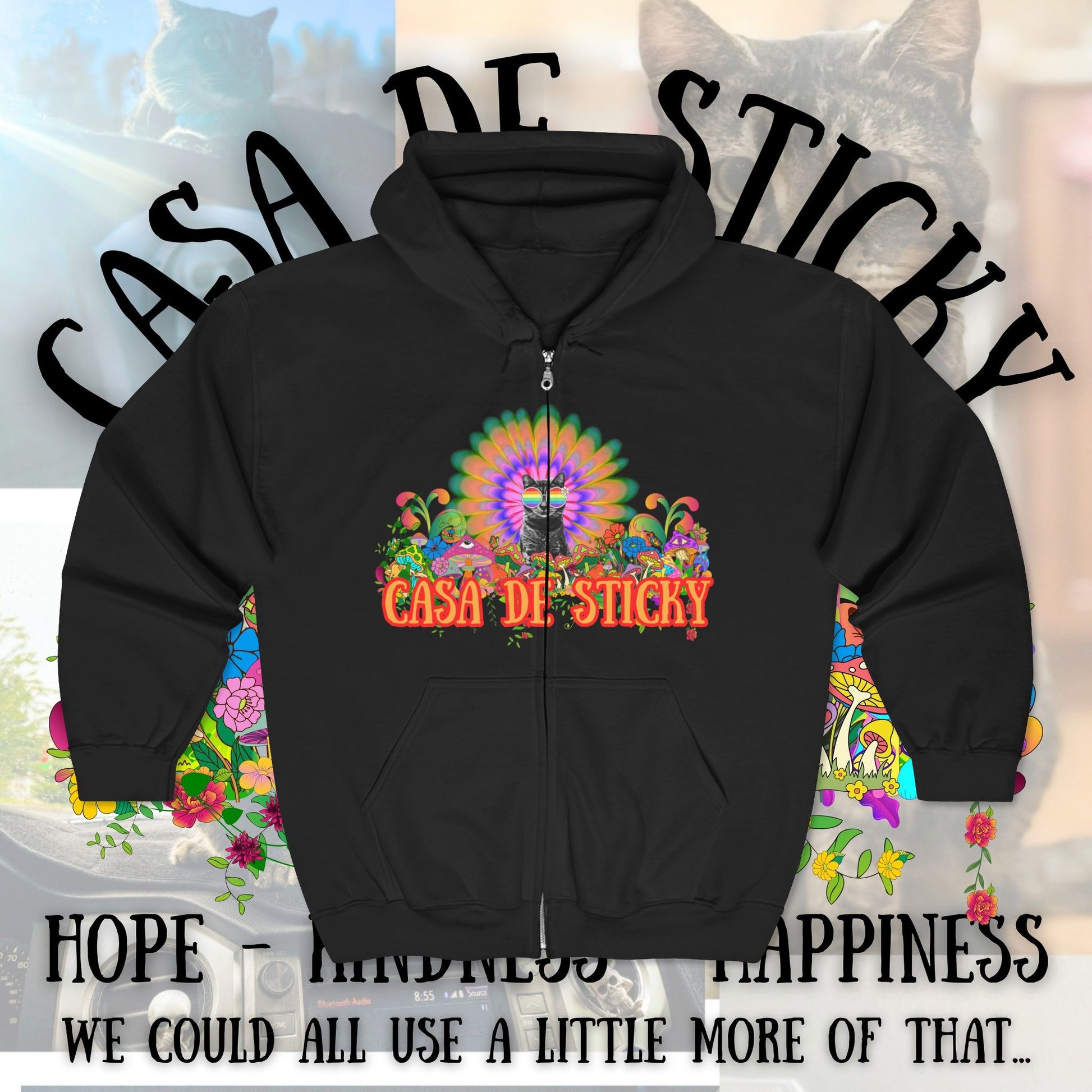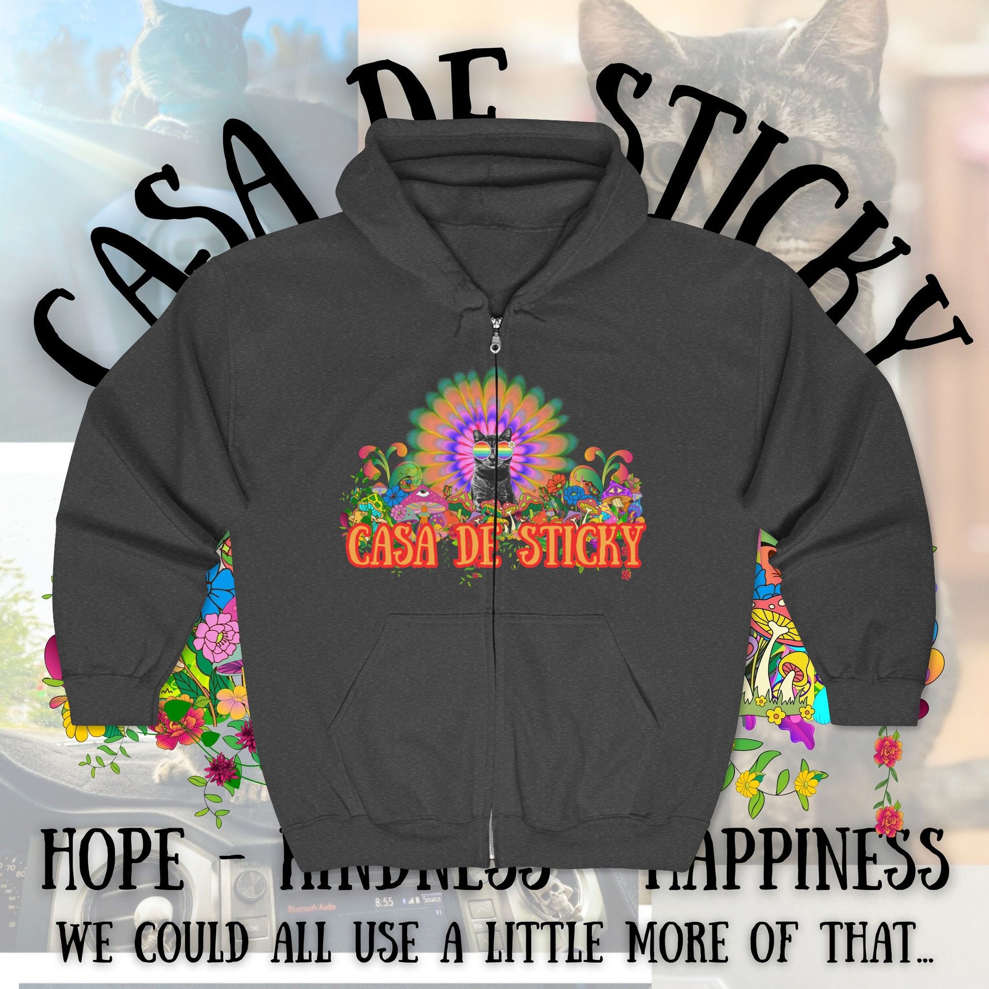 Featuring Sticky at the heart of a vibrant, psychedelic design, this hoodie is more than cozy apparel โ itโs a symbol of the movement youโre helping build. Every hoodie sold directly supports the creation of Casa de Sticky, helping turn heartbreak into healing.