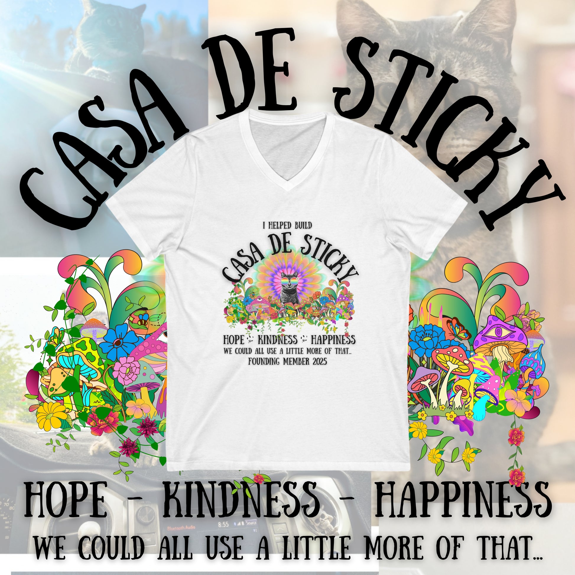 Featuring Sticky the Kitty surrounded by vibrant art and the words Hope โ Kindness โ Happiness, this shirt is more than apparel โ itโs a badge of honor. Every purchase directly supports the creation of Casa de Sticky, helping provide a safe home for senior and special-needs animals and a place where kids can come to learn about love and compassion.
