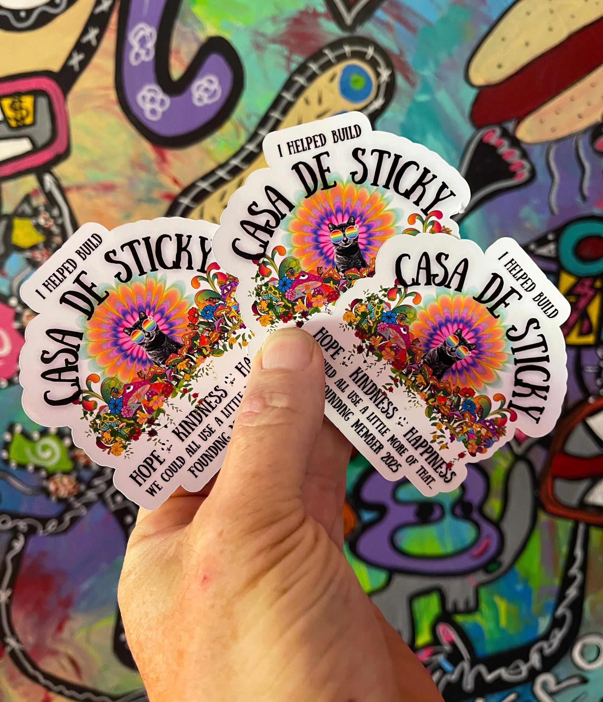 Featuring Sticky at the center of a psychedelic kindness garden, the sticker proudly declares: “I Helped Build Casa de Sticky.” Every sticker sold goes directly to funding the sanctuary — creating a forever home for senior and special-needs animals, and a kindness hub for kids and families.