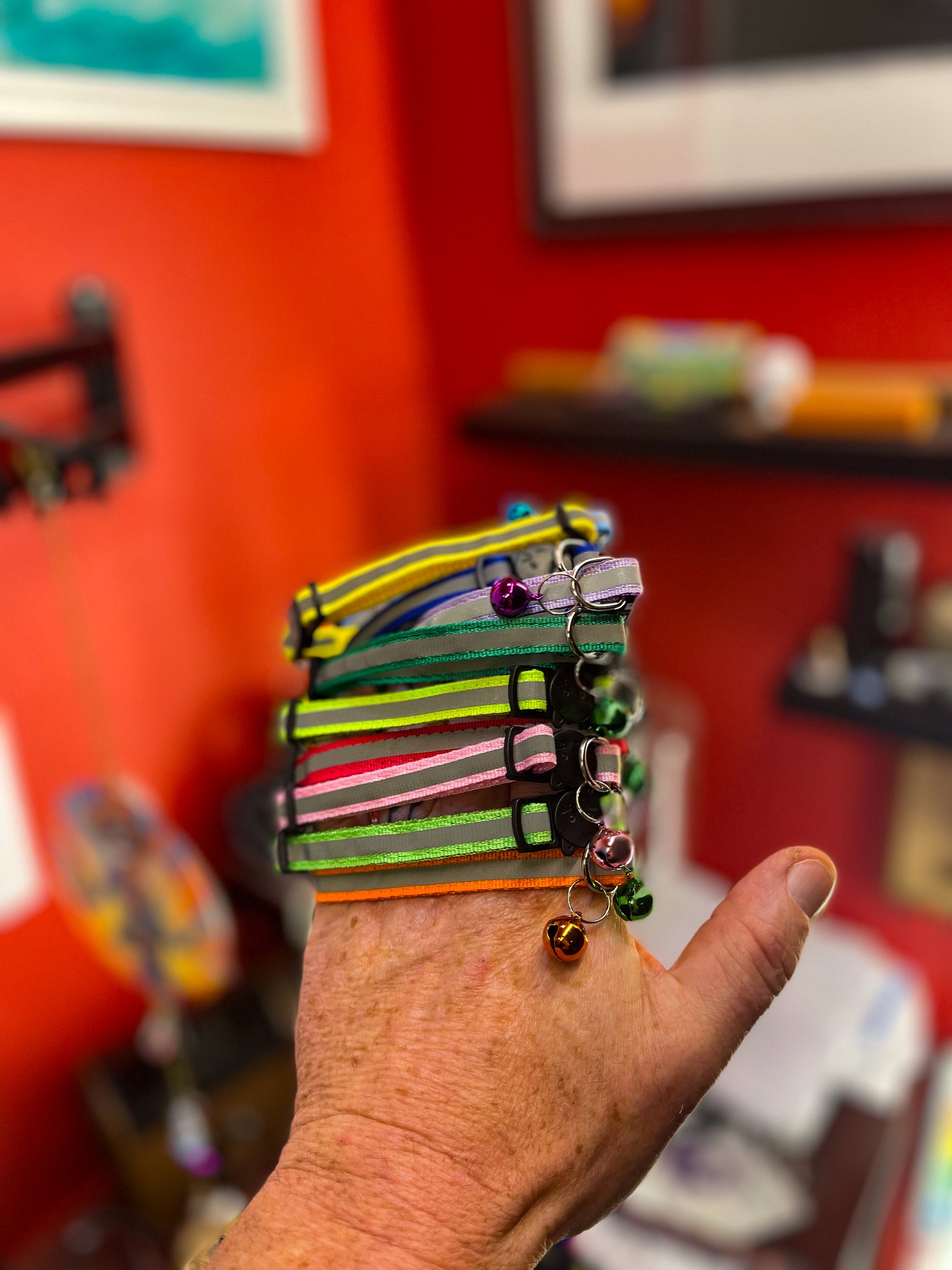 I originally got these so I could find Sylvester in the dark. Meaning dark closets, under dark tables, under the bed… He was so black that if he had his eyes closed, there was no way to see him if he was in a dark spot. But then we realize they fit the little dogs too. And as hard as we try, sometimes these little dogs get out. So we really do use them and they really are good quality and a pretty smart idea if you have any sort of pet buddy with a 12 inch neck or under. And… Pretty cheap!